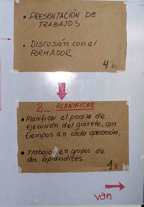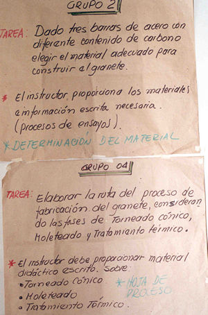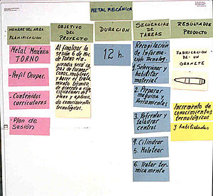 Se trabaja con un "mapa conceptual", visualizando la infomración necesaria para llevar a cabo el proyeto. Según las tareas identificadas a través del "mapa conceptual", se forman grupos de trabajo. Presentamos cómo ejemplo las tareas a realizarzse para dos grupos.