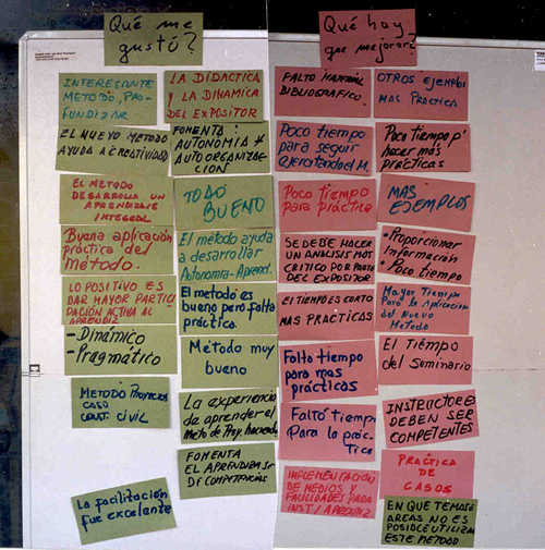 Aquí se puede ver el resultado (visualización) de la evaluación final del taller. Los participantes llenaron las tarjetas según los criterios: "¿Qué me gustó?" y "¿Qué hay que mejorar?"